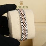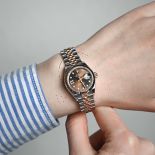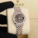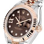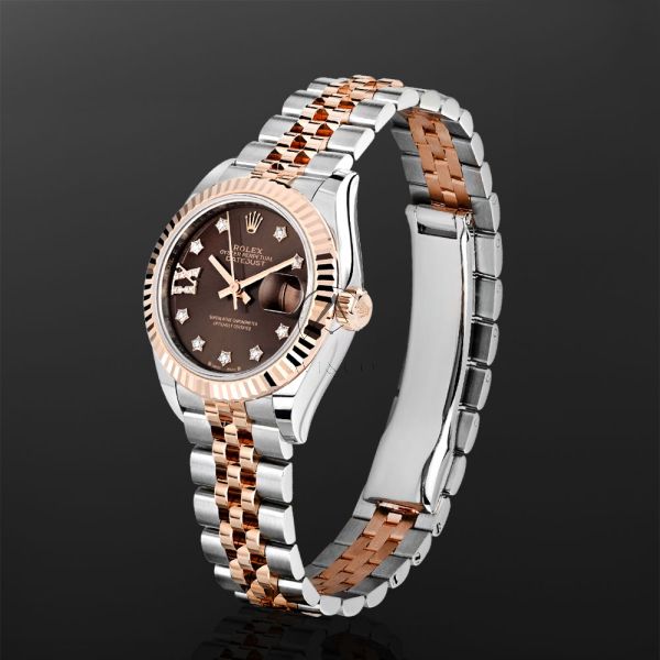 The Rolex Lady-Datejust 279171 is a refined symbol of timeless elegance, crafted from a sophisticated combination of stainless steel and luxurious 18K rose gold. Its petite 28mm case is framed by a classic fluted bezel in rose gold, exuding signature Rolex charm. The rich chocolate dial is set with brilliant-cut diamond hour markers, offering a warm and radiant aesthetic that pairs beautifully with the two-tone construction. Complemented by the elegant Jubilee bracelet, this timepiece delivers exceptional comfort and graceful presence. Powered by a precise automatic movement, the Lady-Datejust 279171 also features the iconic Cyclops lens over the date window for optimal legibility. It is a perfect blend of performance, beauty, and everyday luxury.