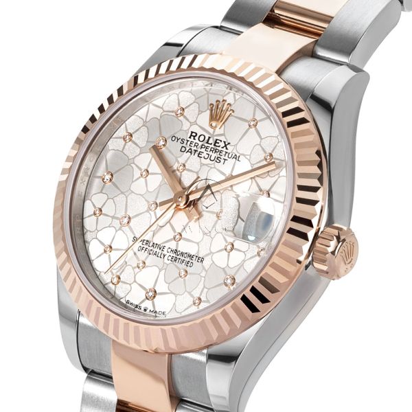 The Rolex Lady-Datejust 278271 elegantly combines durability and artistry, featuring a refined 31mm case crafted from a blend of stainless steel and warm 18K rose gold. Its captivating silver dial showcases a delicate floral motif embellished with sparkling diamond hour markers, adding a touch of feminine charm and sophistication. The watch is completed with the classic Oyster bracelet, offering both comfort and timeless style. Powered by Rolex’s precise automatic movement, this timepiece delivers reliable performance and includes the signature date window with Cyclops lens for easy reading. The Lady-Datejust 278271 with floral diamond dial is a beautiful expression of refined craftsmanship and elegant design.