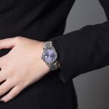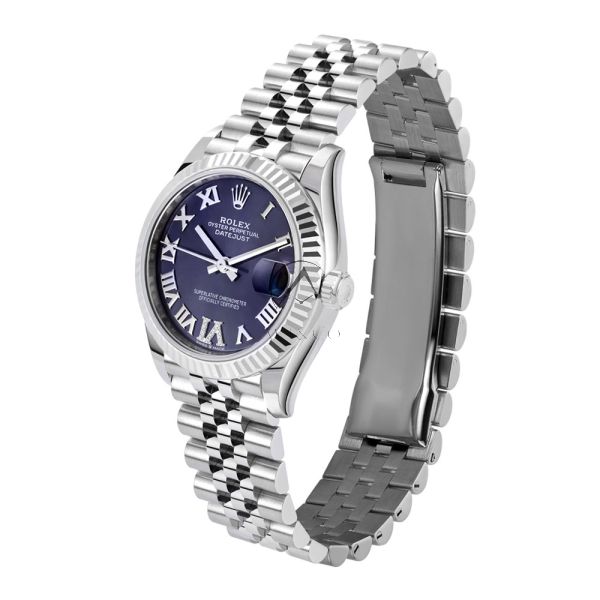 The Rolex Datejust 31 278274 is a striking timepiece that blends timeless design with refined color and craftsmanship. Crafted entirely from stainless steel, its elegant 31mm case is paired with a beautifully fluted 18K white gold bezel, adding classic Rolex character. The rich purple dial stands out with its applied Roman numeral hour markers, offering a unique and regal aesthetic. The watch is completed by the comfortable and sophisticated Oyster bracelet, combining durability with style. Driven by Rolex’s high-performance automatic movement, this model provides precision, reliability, and a date display with the signature Cyclops lens. The 278274 is a perfect choice for those who appreciate bold color in a classic form.
