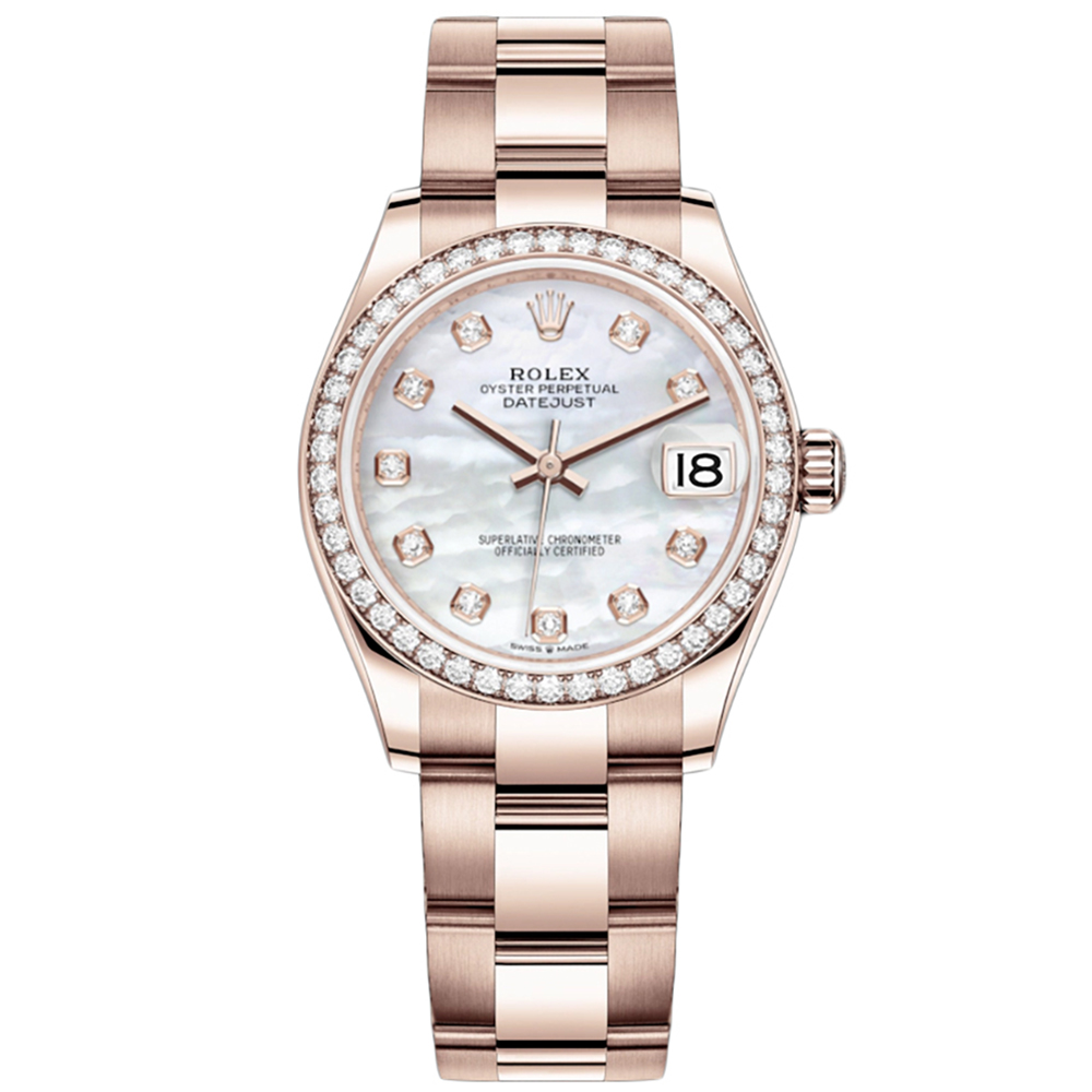 The Lady Datejust 31 is a charming watch with Mother of Pearl dial that strikes the perfect balance between romantic and functional. The everose gold 31 mm case is assembled with a fixed, everose gold bezel with 46 diamonds and a screw-in crown. This timepiece is powered by the self-winding 2236 calibre with a 55-hour power reserve.