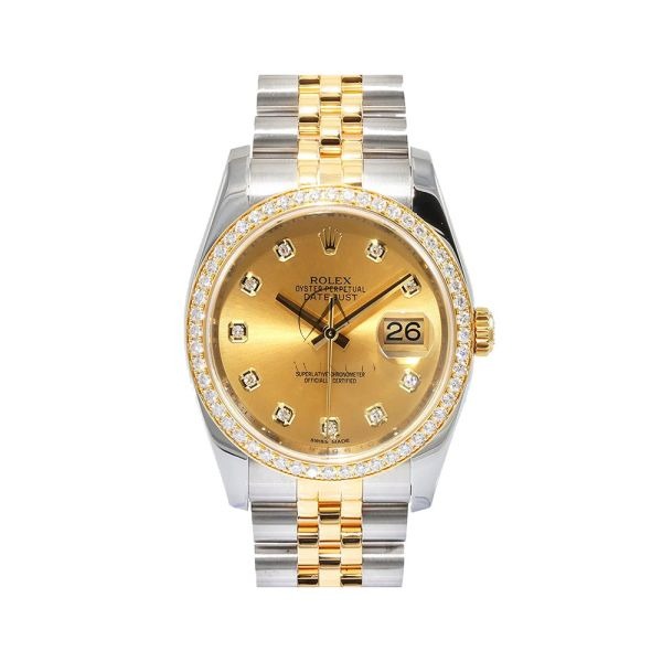 The Rolex Datejust 116243 is a stunning fusion of luxury and sophistication. Featuring a 36mm stainless steel and 18K yellow gold case, this timepiece exudes elegance with its sparkling diamond bezel, adding a touch of brilliance to the classic design. The champagne diamond dial, adorned with radiant diamond hour markers, enhances its luxurious appeal while ensuring exceptional legibility. Powered by the reliable Rolex Caliber 3135 movement, the Datejust 116243 offers precise timekeeping and a 48-hour power reserve. Whether for formal occasions or daily wear, this refined watch seamlessly combines style, performance, and timeless beauty.