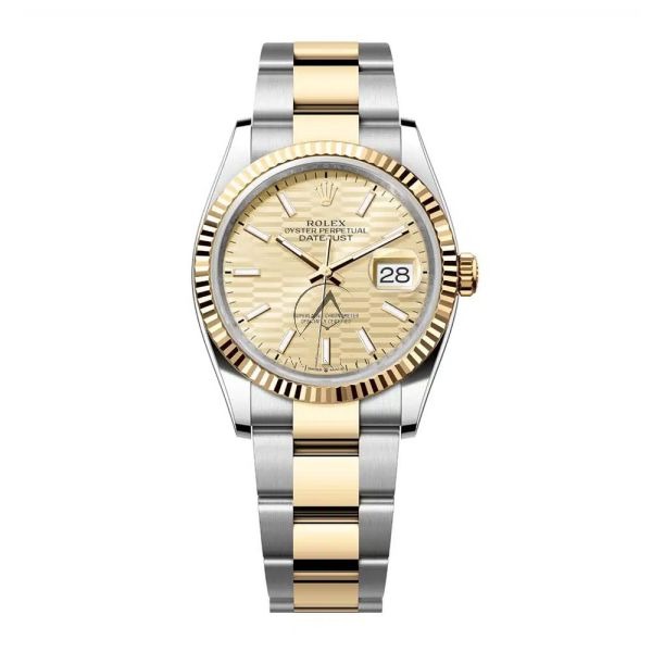 The Rolex Datejust 36 126233 is a refined interpretation of one of Rolex’s most iconic timepieces, blending stainless steel durability with the luxurious warmth of 18K yellow gold. The 36mm Oyster case is flawlessly constructed and fitted with a classic fluted bezel that reflects light with every movement. The champagne motif dial adds visual depth and texture, showcasing a unique pattern that plays beautifully in different lighting. Gold baton hour markers and hands, filled with Chromalight, ensure excellent readability while maintaining an elegant aesthetic. Powered by the Rolex Calibre 3235 movement, this model offers superior chronometer-certified precision, a 70-hour power reserve, and enhanced reliability through Rolex’s latest-generation escapement technology. Completed by a sophisticated Jubilee bracelet with a concealed Crownclasp, the Rolex Datejust 36 126233 is a timeless expression of elegance, performance, and heritage.