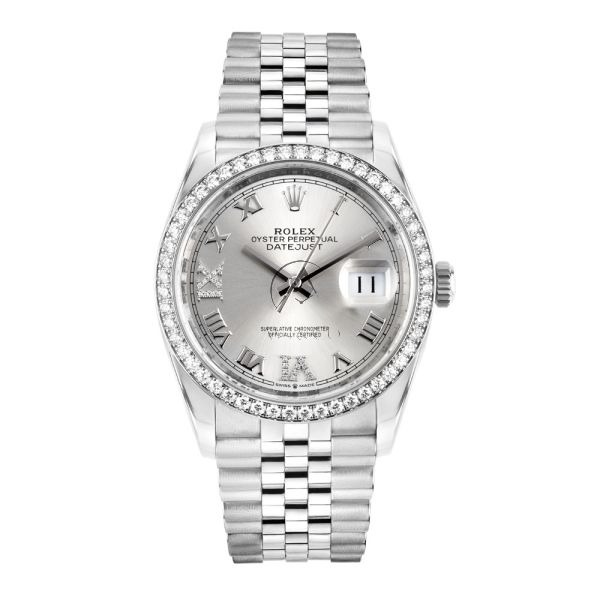 The Rolex Datejust 126284RBR is a masterful blend of iconic design and refined luxury, showcasing a 36 mm Oystersteel case that offers both durability and timeless appeal. Its standout feature, a factory-set diamond bezel, adds an unmistakable brilliance that elevates the watch’s sophisticated aesthetic. The elegant silver dial is enhanced with diamond-set Roman numeral hour markers at VI and XI, providing a subtle yet striking contrast that reflects Rolex’s attention to detail. Powered by the state-of-the-art Calibre 3235 automatic movement, it delivers exceptional precision, reliability, and a robust 70-hour power reserve. The five-piece link Jubilee bracelet ensures a comfortable fit while maintaining a polished, dress-ready look. Combining technical excellence with graceful design, the Datejust 126284RBR is an ideal timepiece for those who value tradition, performance, and discreet opulence.