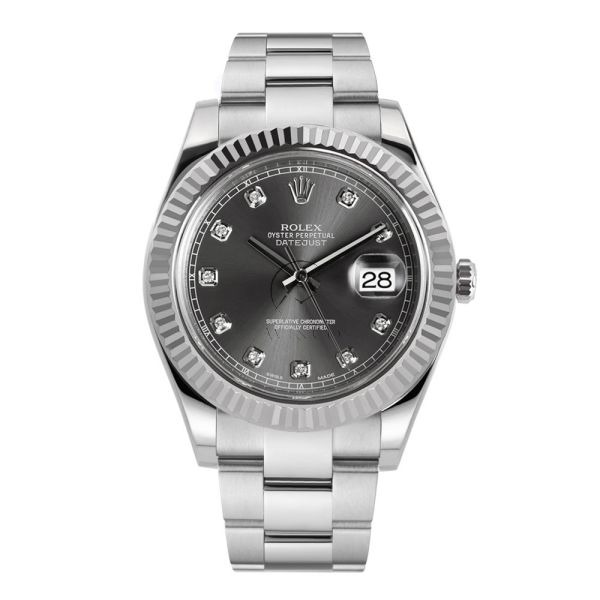 The Rolex Datejust II 116334 combines bold presence with refined elegance, featuring a robust 41 mm Oyster case crafted from stainless steel and crowned with an 18K white gold fluted bezel. Its striking rhodium dial is adorned with factory-set diamond hour markers, offering a perfect balance of subtle luxury and everyday sophistication. The signature Cyclops lens magnifies the date window for enhanced legibility, while the self-winding Rolex movement ensures precision and reliability. Designed for those who appreciate contemporary style with timeless craftsmanship, the 116334 is a commanding yet classic statement piece.