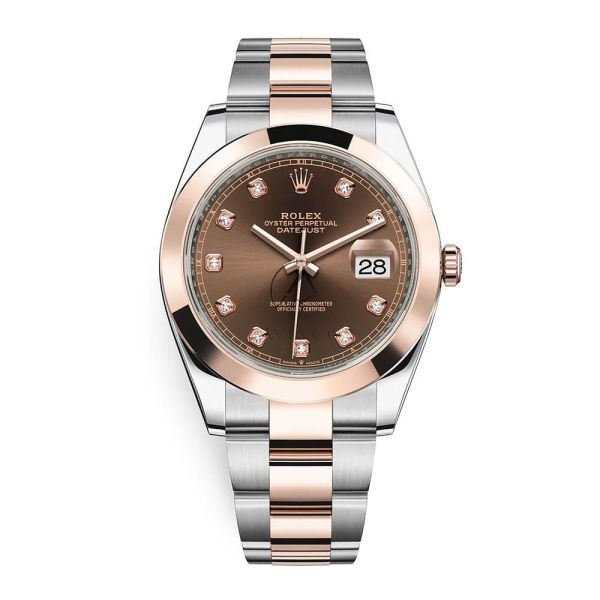 The Datejust’s enduring aesthetics make it instantly recognizable. The 41 mm oystersteel case is assembled with a domed, rose gold bezel, a screw-down crown, and a chocolate dial. This timepiece is powered by the self-winding 3235 calibre with a 70-hour power reserve.