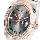 The Rolex Datejust 41 Ref. 126331 is a refined expression of elegance, crafted in Rolexs signature Rolesor combination of Oystersteel and 18K rose gold. This 41mm timepiece showcases the iconic Wimbledon dial, characterized by its slate grey finish and bold green-outlined Roman numeralsan eye-catching design that blends classic styling with a modern edge. The fluted bezel in 18K rose gold adds a luxurious touch, providing contrast and depth to the sporty, sophisticated dial. At 3 oclock, the date display is enhanced by the Cyclops lens for instant readability. Powered by Rolexs advanced Caliber 3235 automatic movement, the watch delivers outstanding precision, reliability, and a 70-hour power reserve. With a robust Oyster case ensuring water resistance and durability, the Datejust 41 126331 offers a timeless look suited for both everyday wear and formal occasions.