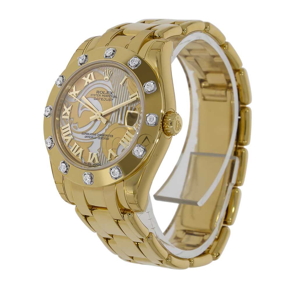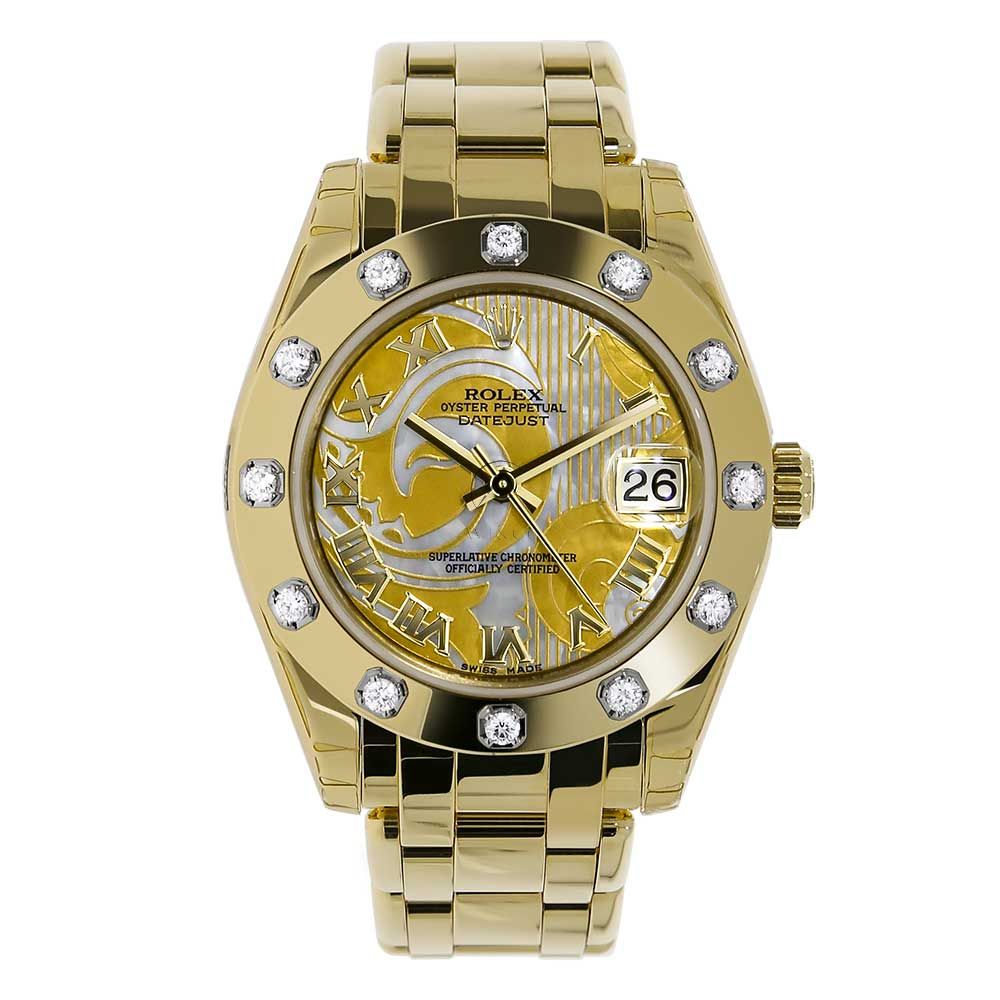 The Rolex Datejust Pearlmaster 81318 in 18K yellow gold is a stunning expression of luxury and craftsmanship. Featuring a 34 mm case, this elegant timepiece showcases a radiant gold mother-of-pearl dial adorned with classic Roman numeral hour markers, offering a refined and luminous display. The smooth bezel and the exquisite Pearlmaster bracelet, known for its rounded five-piece links, add to the watch’s sophisticated charm and comfort. Powered by Rolex’s reliable automatic movement, this Datejust Pearlmaster combines timeless style with precision performance, making it an ideal choice for those seeking elegance in a compact size.