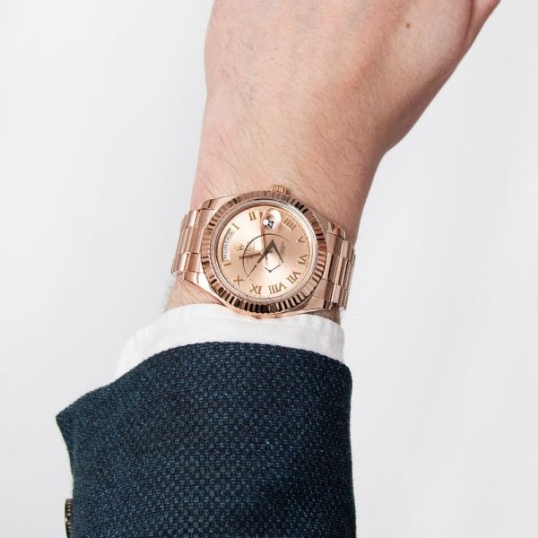 The Rolex Day-Date 218235 is a bold and distinguished timepiece crafted in 18K rose gold, showcasing Rolex’s hallmark blend of luxury and performance. With a commanding 41mm case and fluted bezel, this model stands out with its refined pink gold Roman dial, offering a warm, elegant aesthetic that perfectly complements the Everose gold construction. The signature Day-Date display at 12 o’clock and date window at 3 o’clock ensure practical sophistication, while the President bracelet provides exceptional comfort and prestige. Powered by the Rolex Caliber 3156 automatic movement, the 218235 exemplifies precision, durability, and timeless design for the modern connoisseur.