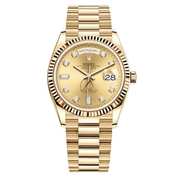 The Rolex Day-Date watches are the crown jewels of the Rolex collection, and a longstanding icon worn by world leaders and the rich and famous. Introduced in 1956, the Day-Date made immediate waves as it was the first watch to spell out the full day of the week. The yellow gold 36 mm case is assembled with a fluted, yellow gold and a water resistance of 330 feet. This timepiece is powered by the 3255 calibre with a 70-hour power reserve.
