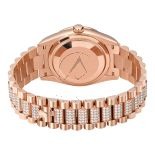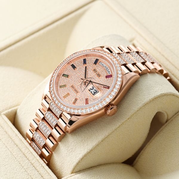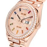 The Rolex Day-Date 36 128345RBR is the ultimate symbol of elegance, luxury, and craftsmanship. Set in 18K rose gold, this 36mm masterpiece features a stunning pave rainbow baguette diamond dial that adds a vibrant, colorful touch to the iconic Day-Date design. The dial is meticulously crafted with an array of baguette-cut diamonds in hues of red, orange, yellow, green, blue, and purple, creating a mesmerizing display of color thats impossible to ignore. Paired with the prestigious President bracelet, this timepiece exudes sophistication and exclusivity. Powered by the renowned Rolex Caliber 3255, the Day-Date 128345RBR offers exceptional accuracy and a 70-hour power reserve. With its combination of luxurious materials, timeless design, and precision engineering, the Day-Date 36 is an ideal choice for those who appreciate both form and function in a truly exceptional watch.