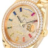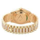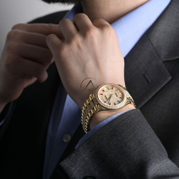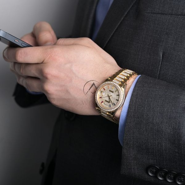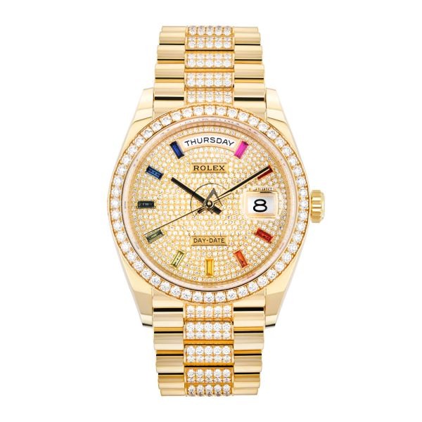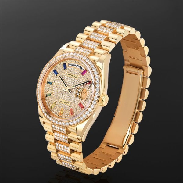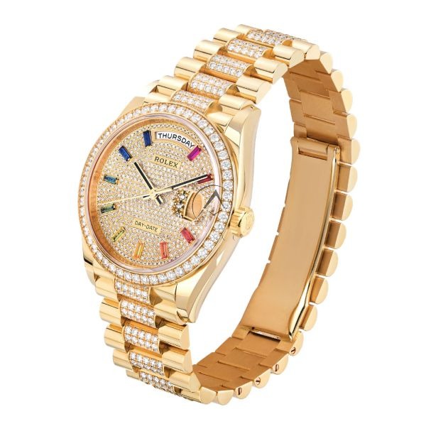 The Rolex Day-Date 36 reference 128348RBR is the epitome of luxury and prestige, crafted from solid 18K yellow gold and enhanced with exquisite diamond detailing. The 36mm case is complemented by a factory-set diamond bezel that radiates brilliance from every angle. Its dial, adorned with diamond hour markers, adds an extra layer of opulence to this iconic timepiece. The watch is fitted with the elegant President bracelet, known for its semi-circular, three-piece links, offering both comfort and timeless sophistication. At its heart is the Rolex Caliber 3255, a self-winding movement celebrated for its precision, durability, and 70-hour power reserve. The 128348RBR is more than a timekeeping instrument; it is a statement of excellence and refined elegance, perfectly suited for the most discerning collector.