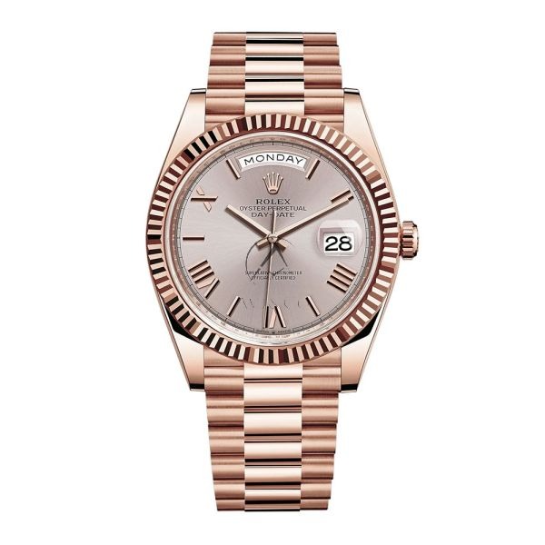 The Rolex Day-Date 40 ref. 228235 is the epitome of timeless prestige and horological excellence. Crafted in solid 18K Everose gold, Rolexs exclusive rose gold alloy, the 40mm case exudes warm elegance and lasting brilliance. The Sundust dial, paired with classic Roman numeral hour markers, offers a subtle sunray finish that enhances its refined character. As the flagship model of the brand, the Day-Date proudly displays both the day of the week spelled out in full and the date, enhanced by Rolexs signature Cyclops lens. Powered by the self-winding Caliber 3255 movement, it delivers exceptional precision, power reserve, and reliability. Finished with the iconic President bracelet, the Day-Date 40 stands as a symbol of status, success, and impeccable style.