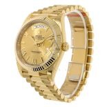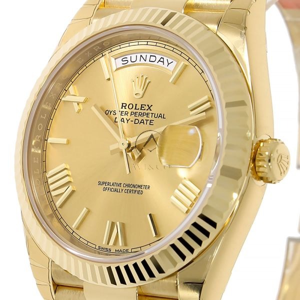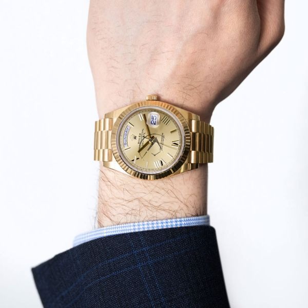 The Rolex Day-Date 40 reference 228238 is a luxurious timepiece that sets a new benchmark. This elegant watch features a champagne dial with yellow gold components. The case of this watch measures 40mm and has a monobloc middle case, screw-down case back, and winding crown. It also has a sapphire crystal and a fluted yellow gold bezel. The champagne dial is adorned with yellow gold Roman numeral hour markers and hands. The Rolex Day-Date 40 reference 228238 is powered by the signature Rolex caliber 3255, which has an instantaneous day and date function, a precision of 2/+2 sec/day, and a power reserve of 70 hours. The watch comes with a president bracelet, which has semi-circular three-piece links and a concealed folding crown clasp. It has a water resistance of 100 meters (330 feet).