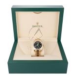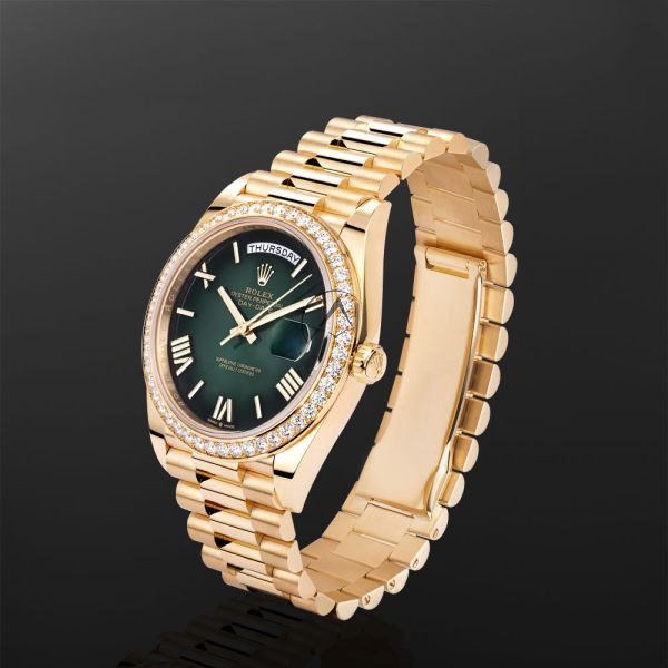 The Rolex Day-Date 40 (Reference 228348RBR) is a luxurious timepiece that embodies the pinnacle of watchmaking excellence. This 2024 model features an 18k yellow gold case with a diamond-set bezel, a striking green Roman numeral dial, and a matching yellow gold President bracelet. Powered by the self-winding Calibre 3255 movement, this watch offers a 70-hour power reserve and precise timekeeping. With its iconic design, exceptional quality, and prestigious status, the Day-Date 40 is a symbol of luxury and sophistication.