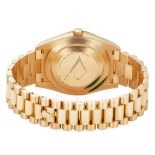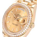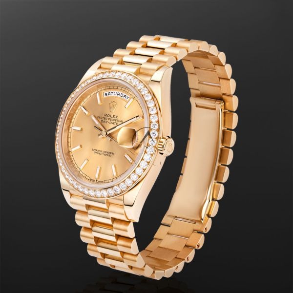 The Rolex Day Date 40, model 228348, is an exquisite watch that is sure to attract attention with its dazzling diamonds that sparkle in any setting. The 40mm case is constructed with a monobloc middle case, screw-down case back, and winding crown, making it sturdy and long-lasting. The watch is equipped with a sapphire crystal and a bezel that is studded with diamonds set in yellow gold. The green-colored dial displays a date window at 3 o’clock and a day window at 12 o’clock. Powered by the signature Rolex caliber 3255, this timepiece delivers instantaneous day-and-date functionality, with a precision of 2/+2 sec/day and an impressive power reserve of 70 hours while boasting a water resistance of up to 100m.