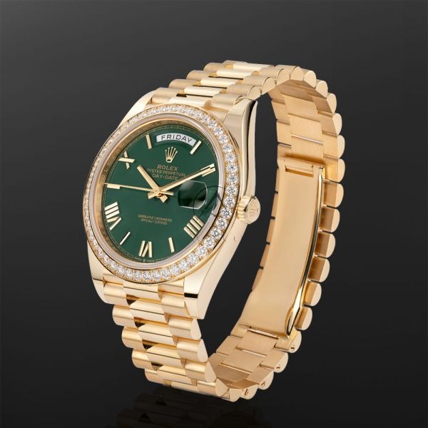 The Rolex Day-Date 40 228348RBR is the epitome of prestige and sophistication. Crafted in 18K yellow gold, this 40mm timepiece radiates luxury with its rich enamel green Roman dial, offering a bold yet timeless aesthetic. The bezel is adorned with brilliant-cut diamonds, adding an extra touch of opulence to its already distinguished design. Known as the “President’s Watch,” the Day-Date 40 showcases Rolexs signature day and date windows at 12 and 3 oclock, delivering both elegance and practicality. Powered by the self-winding Caliber 3255 movement, it ensures exceptional accuracy and reliability. Completed with the iconic Presidential Jubilee bracelet, the Rolex Day-Date 40 228348RBR is a true statement piece, perfect for those who demand the highest level of craftsmanship and style.
