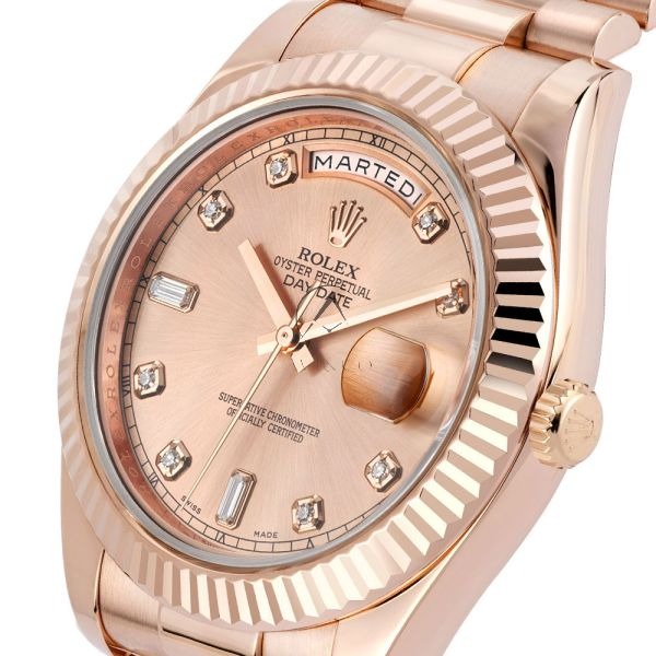The Rolex 218235 is a pinnacle of luxury and precision craftsmanship. Crafted from lavish 18K Everose gold, this timepiece exudes refinement and style at every glance. Its 41mm case size makes a bold yet refined statement on the wrist, the centerpiece of this extraordinary watch is its captivating pink baguette diamond dial, adding a touch of glamour and brilliance to every moment. Powered by a self-winding automatic movement.