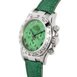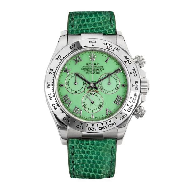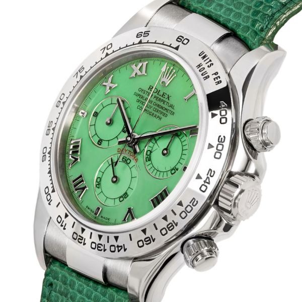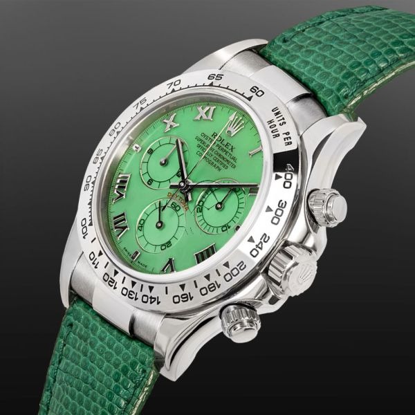 The Rolex Daytona 116519 is a refined and distinctive take on the legendary chronograph, offering luxurious materials and elegant design cues. Crafted from 18K white gold, the 40mm case showcases the perfect balance between sport and sophistication. Its standout feature is the rich green dial adorned with Roman numeral hour markers and contrasting chronograph subdials, offering both classic charm and practical functionality. Paired with a green leather strap, the color-coordinated look adds a bold yet tasteful flair to this iconic timepiece. Equipped with the Rolex Caliber 4130, the Daytona delivers superior chronograph performance, precision, and a 72-hour power reserve. Water-resistant up to 100 meters and fitted with a white gold folding clasp, the 116519 merges high horology with unmistakable presencea favorite among collectors seeking both rarity and elegance.