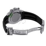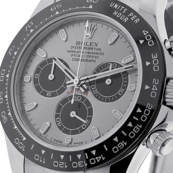 The Rolex Daytona 116519LN in 18K white gold is a striking chronograph that blends motorsport heritage with refined luxury. Its 40 mm case is crafted from solid white gold and paired with a sleek grey sunray dial featuring black chronograph subdials and luminous index hour markers for high legibility. A black Cerachrom ceramic bezel with an engraved tachymetric scale enhances both durability and sporty appeal. This Daytona is powered by Rolex’s caliber 4130 automatic chronograph movement, known for its reliability, precision, and 72-hour power reserve. Paired with a high-performance black Oysterflex rubber strap and secured with an 18K white gold folding clasp, the 116519LN offers the perfect balance of elegance, comfort, and functionality for those who demand style and substance.