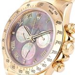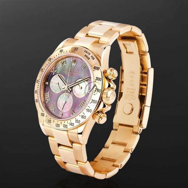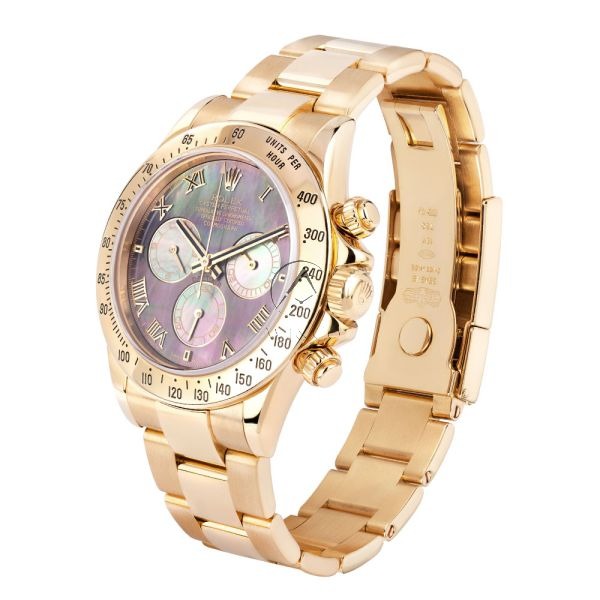 The Rolex Cosmograph Daytona 116528 is a luxurious timepiece featuring a 40mm 18k yellow gold case, a tachymeter bezel, and a mother-of-pearl dial with Roman numerals and sub-dials. Powered by the in-house Caliber 4130, this timepiece offers exceptional precision, a 72-hour power reserve, and is a certified chronometer. The matching 18k yellow gold Oyster bracelet completes the luxurious design.