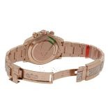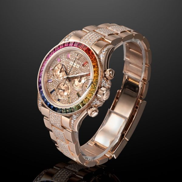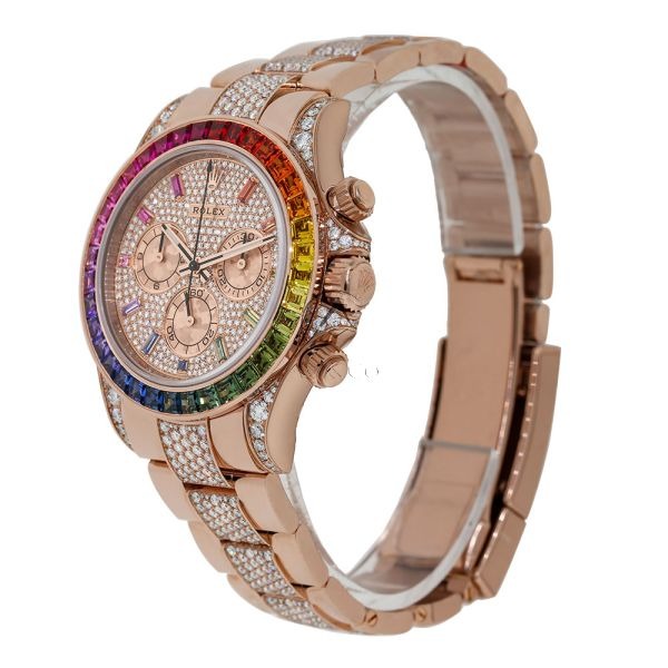 Rolex delivers spectacular design by combining the illumination of rainbow jewels with rose gold Rolex architecture. The Cosmograph Daytona was created to master the speed of timekeeping by featuring a chronograph, a 30-minute counter and stop seconds for precise time setting. It comes with a 40mm rose gold case that has a screw-down case back, a scratch-resistant sapphire and features a bejewled 18K rose gold bezel. Enclosed in the case is the 4130 Caliber that has bidirectional self-winding via Perpetual rotor, a-2/+2 sec/day precision and a 72-hour power reserve. The dial is rose gold, diamond encrusted with rainbow-jeweled index hour indicators and three rose gold sub-dials. The bezel features a pave design of rainbow-colored jewels. The oyster bracelet is made of 18-carat rose gold and the center links are encrusted with diamonds. It is topped off by a bedecked rose gold oysterlock safety clasp. It has a water resistance of 100 meters (330 feet).