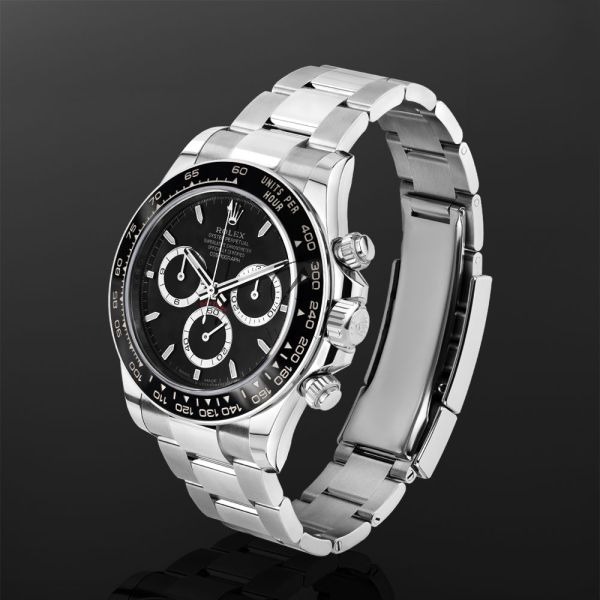 The Rolex Daytona 126500LN is the latest evolution of Rolex’s legendary chronograph, crafted in stainless steel for timeless versatility and durability. Its 40mm Oyster case is fitted with a black Cerachrom bezel engraved with a tachymetric scale, paying homage to the Daytona’s motorsport heritage. The sleek black dial features contrasting white subdials, luminous hour markers, and polished hands for exceptional legibility and balance. Inside, the watch is powered by the Caliber 4131 automatic chronograph movement, offering outstanding precision, smooth operation with its vertical clutch, and a 72-hour power reserve. The solid-link Oyster bracelet provides comfort and reliability, secured with Rolex’s Oysterlock safety clasp. Blending performance, precision, and iconic design, the 126500LN is a modern Daytona that upholds the legacy of one of Rolex’s most celebrated timepieces.