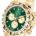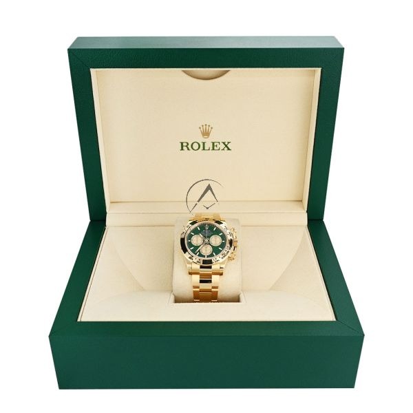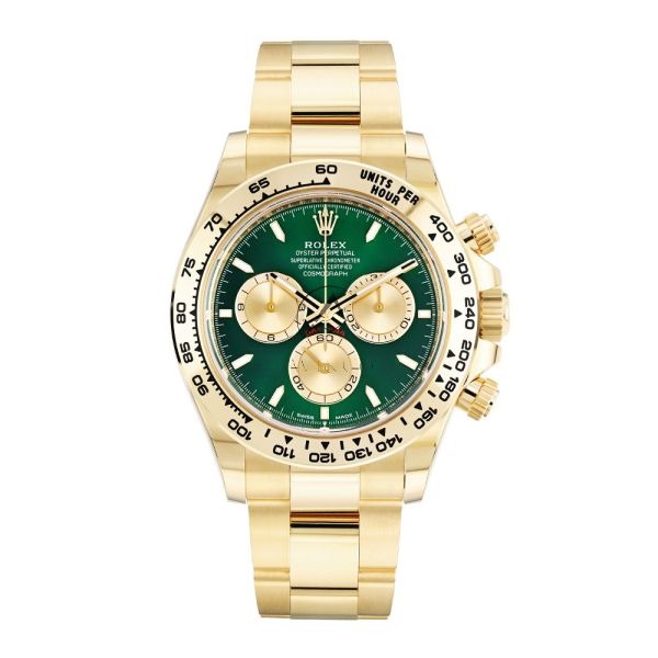The Rolex Daytona 126508, nicknamed the John Mayer 2.0, is a striking blend of precious metal craftsmanship and vivid color. Crafted in solid 18K yellow gold, the 40mm Oyster case is paired with a matching Oyster bracelet, delivering a seamless and luxurious look. The radiant green sunburst dial is accented by contrasting gold subdials, creating an eye-catching aesthetic that has made this reference a favorite among collectors. Equipped with the in-house Caliber 4131 automatic chronograph movement, it offers exceptional precision, a 72-hour power reserve, and smooth functionality thanks to its vertical clutch system. The engraved tachymeter bezel reinforces its motorsport heritage, while the flawless finishing underscores its position as a modern icon in the Daytona lineup.