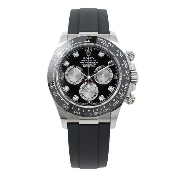 The Rolex Daytona 16519LN is a refined and sporty chronograph crafted entirely in 18K white gold, offering an elegant take on one of Rolex’s most iconic timepieces. Measuring 40 mm, this luxurious model features a deep black dial adorned with factory-set diamond hour markers, combining bold aesthetics with a touch of opulence. The dial also includes silver-toned chronograph sub-dials for precise timekeeping, while the black Cerachrom ceramic bezel is engraved with a tachymetric scale, emphasizing the Daytona’s racing pedigree. Powered by the reliable Calibre 4130 automatic movement, it delivers exceptional chronograph performance and a 72-hour power reserve. Paired with a sleek Oysterflex bracelet, the Daytona 16519LN merges high-performance engineering with modern elegance and timeless Rolex craftsmanship.
