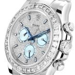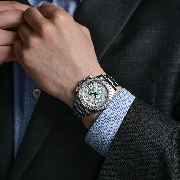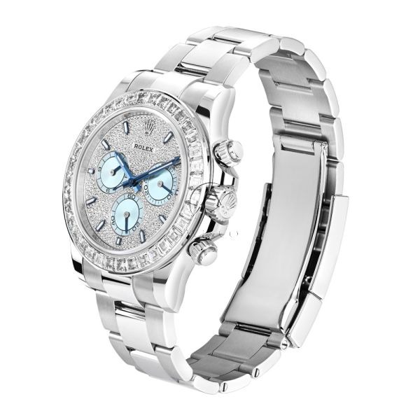 The Rolex Daytona 126576TBR is the epitome of luxury and sophistication. Crafted from platinum, the 40mm case is complemented by a dazzling pave diamond dial, adding an extraordinary touch of elegance to this iconic chronograph. The Ascher cut bezel enhances the watchs refined aesthetics, showcasing exquisite craftsmanship and a timeless design. Renowned for its precision, the Daytona 126576TBR is powered by Rolex’s reliable automatic movement, ensuring unparalleled accuracy. This exquisite timepiece is a perfect fusion of high-performance functionality and exceptional style, making it a true statement piece for the discerning collector.