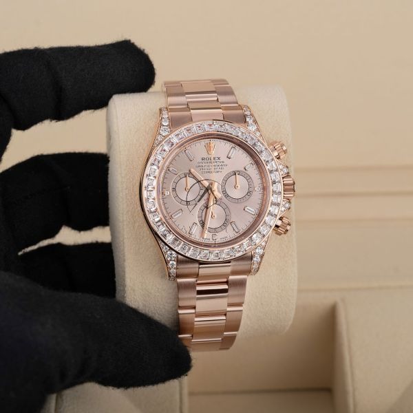 The Rolex Cosmograph Daytona 126595TBR is an extraordinary expression of prestige and performance, crafted in luxurious 18k Everose gold and set with a dazzling diamond bezel that elevates its legendary motorsport heritage. Its 40mm Oyster case houses a radiant Sundust dial adorned with diamond hour markers and sub-dials outlined in rose gold, blending technical brilliance with refined aesthetics. Driven by the high-performance Caliber 4131 automatic chronograph movement, this timepiece ensures precision timekeeping and a power reserve of approximately 72 hours. Fitted with the elegant and durable Oysterflex bracelet, reinforced with a flexible titanium and nickel blade, and secured by a Rolex Glidelock-equipped folding clasp, the Daytona 126595TBR is both bold and sophisticated—perfect for those who demand unmatched style with uncompromising performance.