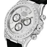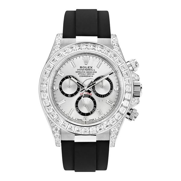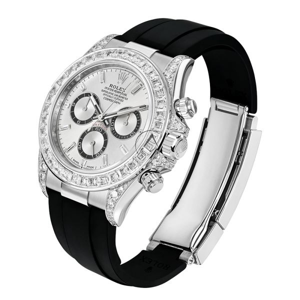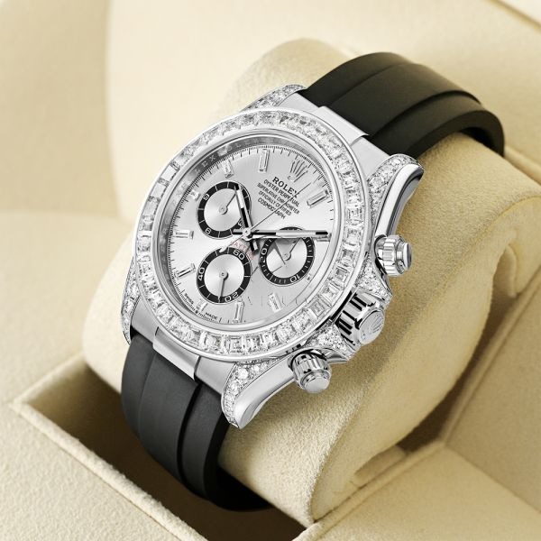The Rolex Cosmograph Daytona 126598TBR in 18K white gold is a masterful blend of precision engineering and refined luxury. Featuring a 40mm Oyster case in polished white gold, this timepiece exudes understated elegance. Its silver sunburst dial is detailed with luminous hour markers and three chronograph sub-dials, offering both visual balance and high-performance functionality. Surrounding the dial is a diamond-set bezel, showcasing Rolexs renowned gem-setting expertise with brilliant-cut diamonds that add a striking brilliance to the watch’s clean aesthetic. At its core is the Calibre 4131, an in-house automatic chronograph movement offering a 72-hour power reserve and Superlative Chronometer certification for unmatched accuracy. The watch is fitted with a black Oysterflex bracelet, combining the comfort of elastomer with the durability of flexible titanium-nickel blades, and secured with an 18K white gold Oysterlock clasp. Water-resistant to 100 meters, this Daytona is an iconic timepiece designed for those who appreciate technical mastery, modern luxury, and timeless style.