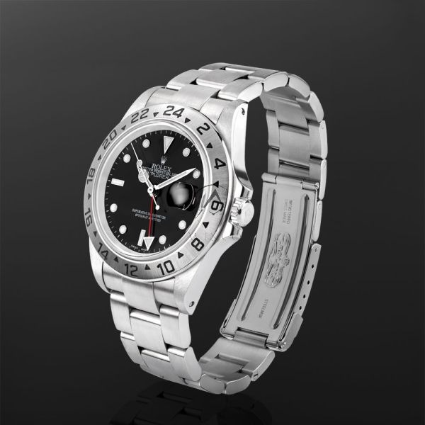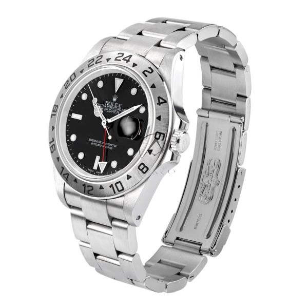 The Rolex Explorer II 16570 is a rugged and reliable 40mm timepiece designed for adventurers and everyday wear alike. Crafted entirely from robust stainless steel, it features a bold black index dial with luminous markers and hands for optimal readability in all conditions. The fixed 24-hour bezel paired with the distinctive orange GMT hand allows for tracking a second time zone, making it perfect for explorers and travelers. Powered by Rolex’s trusted automatic movement, this watch offers precision and durability, while the classic Oyster bracelet ensures comfort and a sporty, timeless look. The Explorer II 16570 is the ultimate companion for those who seek adventure without compromising style.
