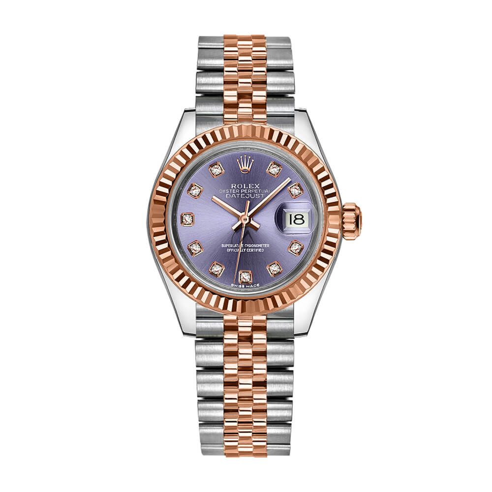 The Lady Datejust 28 is a charming watch with aubergine dial that strikes the perfect balance between romantic and functional. The two-tone stainless steel and everose gold 28 mm case is assembled with a fluted, everose gold bezel, cyclops lens over the date, and screw-down crown with twinlock double waterproofness system. This timepiece is powered by the self-winding 2236 calibre with a 55-hour power reserve.