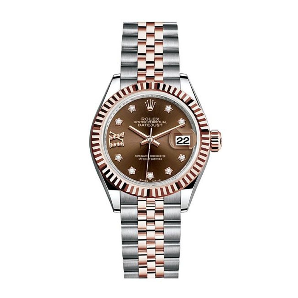The Lady Datejust 28 is a charming watch with chocolate dial that strikes the perfect balance between romantic and functional. The two-tone stainless steel and everose gold 28 mm case is assembled with a fluted, everose gold bezel, cyclops lens over the date, and screw-down crown with twinlock double waterproofness system. This timepiece is powered by the self-winding 2236 calibre with a 55-hour power reserve.