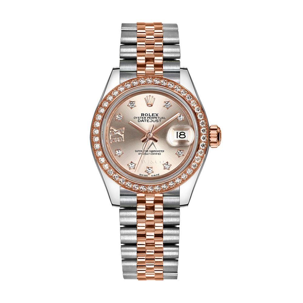 The Lady Datejust 28 is a charming watch with a Rose diamond dial that perfectly balances romantic and functional. The two-tone rose gold and steel 28 mm case is assembled with a diamond bezel and screw-down crown. This timepiece is powered by the 2236 calibre with a 55-hour power reserve.