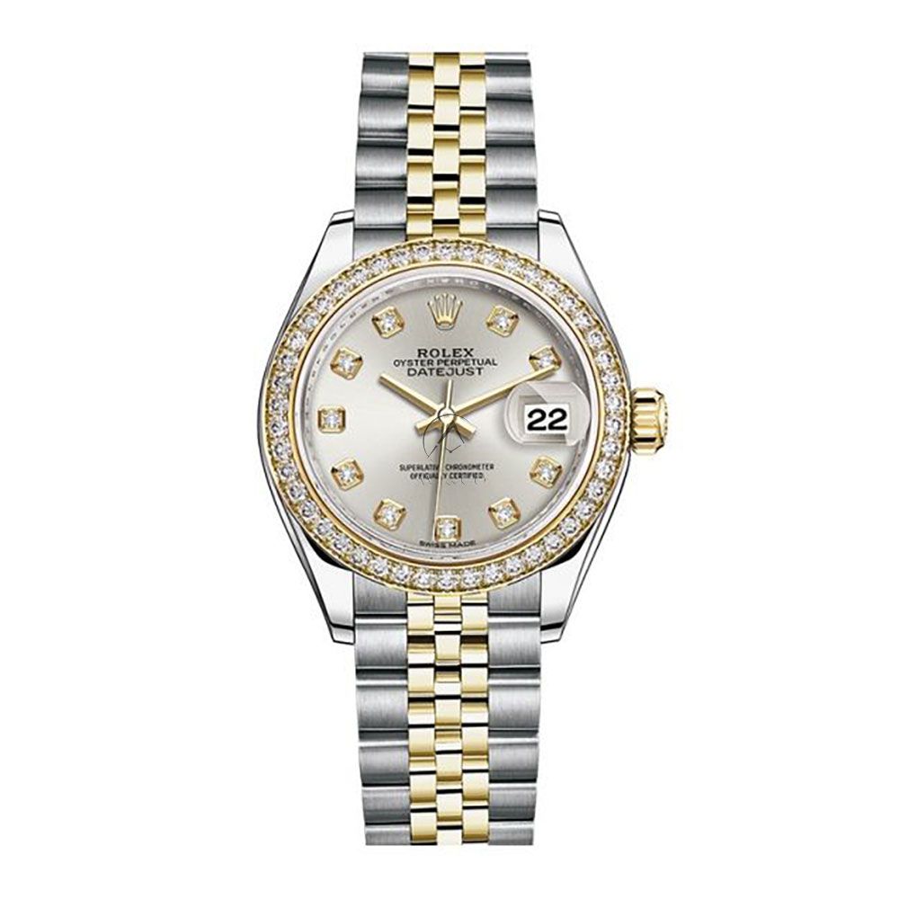 The light reflections on the case sides and lugs highlight the elegant profile of Rolex’s classic feminine watch. The two-tone yellow gold and stainless steel 28 mm case is assembled with a diamond bezel and a screw-down crown. This timepiece is powered by the Rolex 2236 calibre and a 55-hour power reserve.