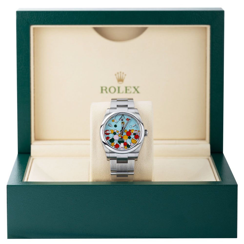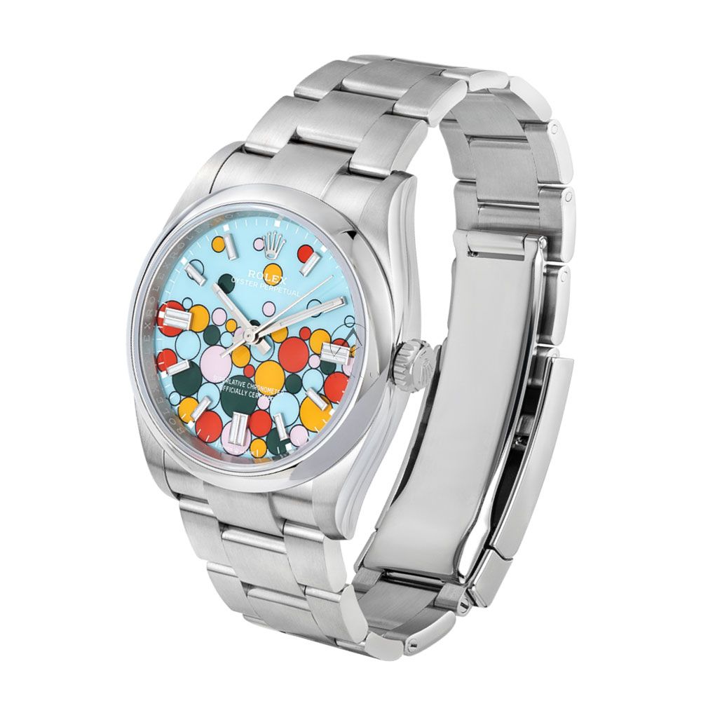 The Rolex Oyster Perpetual 126000 with the Celebration Dial is a bold and joyful expression of Rolex’s modern aesthetic and precision watchmaking. Crafted from corrosion-resistant Oystersteel, the 36mm case strikes the perfect balance between comfort and presence on the wrist. The standout feature is the eye-catching turquoise “Celebration” dial, adorned with a whimsical arrangement of colorful bubbles in pink, green, orange, and yelloweach shade inspired by other Oyster Perpetual dial variations. Luminous baton hour markers and classic Oyster hands ensure readability, while the screw-down crown and Oyster case guarantee water resistance up to 100 meters. Powered by the in-house Caliber 3230 movement, the watch delivers high-performance timekeeping, a 70-hour power reserve, and Rolexs Superlative Chronometer certification. The 126000 Celebration Dial is a fresh, artistic take on Rolex traditionperfect for collectors and enthusiasts who appreciate both craft and creativity.