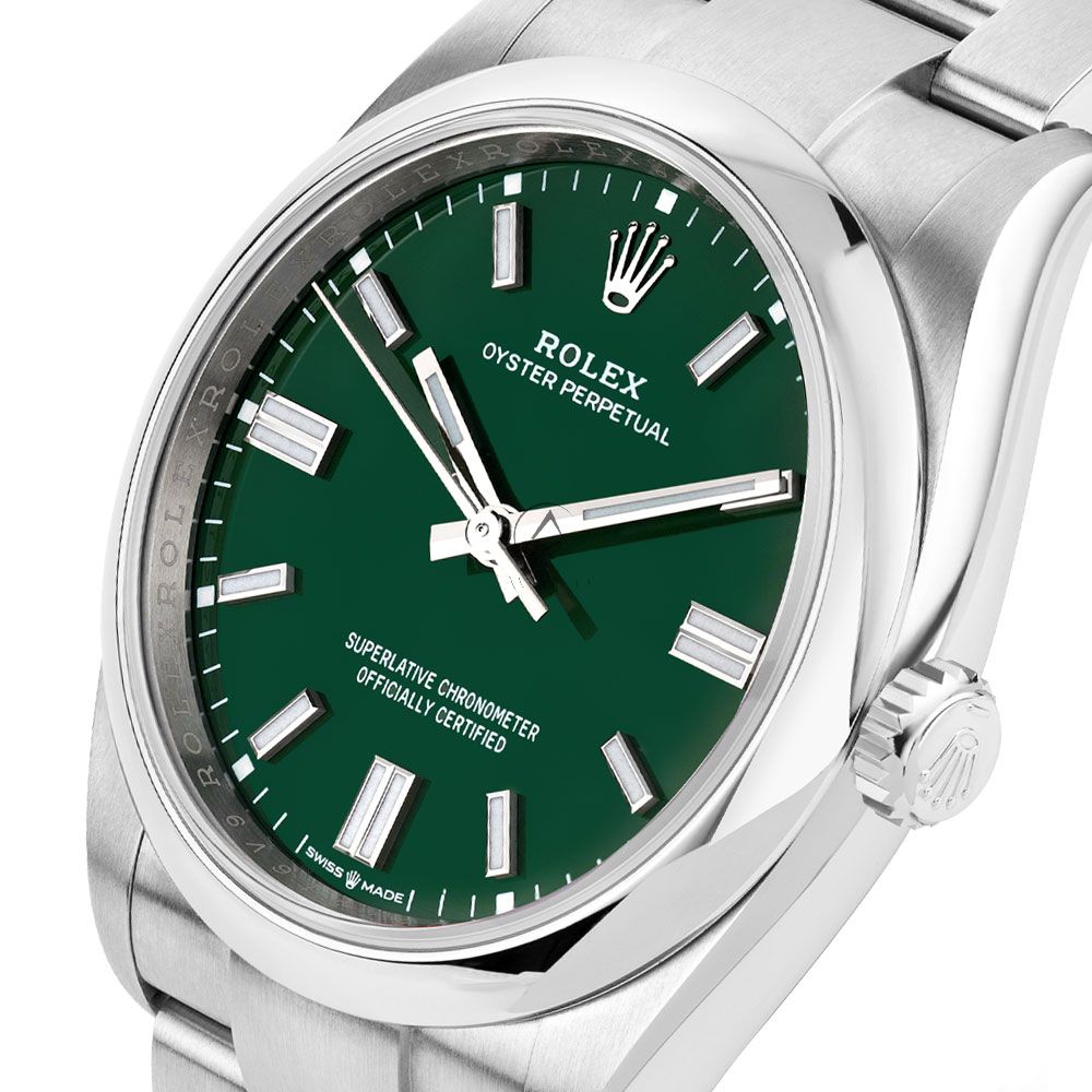 The Rolex Oyster Perpetual 126000 with a green index dial brings a modern twist to a timeless design, offering bold color in a refined and versatile 36mm case. Crafted from Rolexs corrosion-resistant Oystersteel, this timepiece delivers everyday durability while maintaining a polished, elegant look. The rich green sunray-finished dial is accented by luminous baton hour markers and hands, ensuring excellent visibility and a clean, contemporary aesthetic. Inside, the watch is powered by the state-of-the-art Caliber 3230 automatic movement, delivering precision, a 70-hour power reserve, and Superlative Chronometer performance. Fitted with a brushed Oyster bracelet and Oysterclasp, the 126000 combines robust functionality with effortless stylemaking it a standout choice for those who appreciate minimalist design with a splash of character.