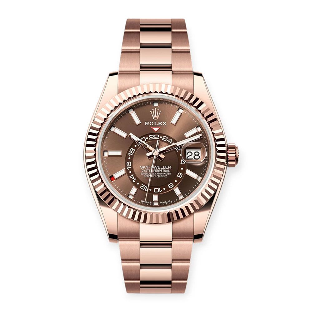 The Rolex Sky-Dweller 326935 in 18K Everose gold is the perfect embodiment of innovation wrapped in timeless luxury. With its commanding 42mm case, this sophisticated timepiece stands out with a rich chocolate dial featuring luminous index hour markers, offering excellent legibility and a warm, refined aesthetic. Designed for global travelers, it features Rolexs signature annual calendar and dual time zone display via the off-center 24-hour discboth easily set through the ingenious Ring Command bezel. The solid 18K Everose gold Oyster bracelet with polished center links ensures both comfort and prestige on the wrist. Combining technical mastery with bold elegance, the Sky-Dweller 326935 is a powerful statement of precision and presence.