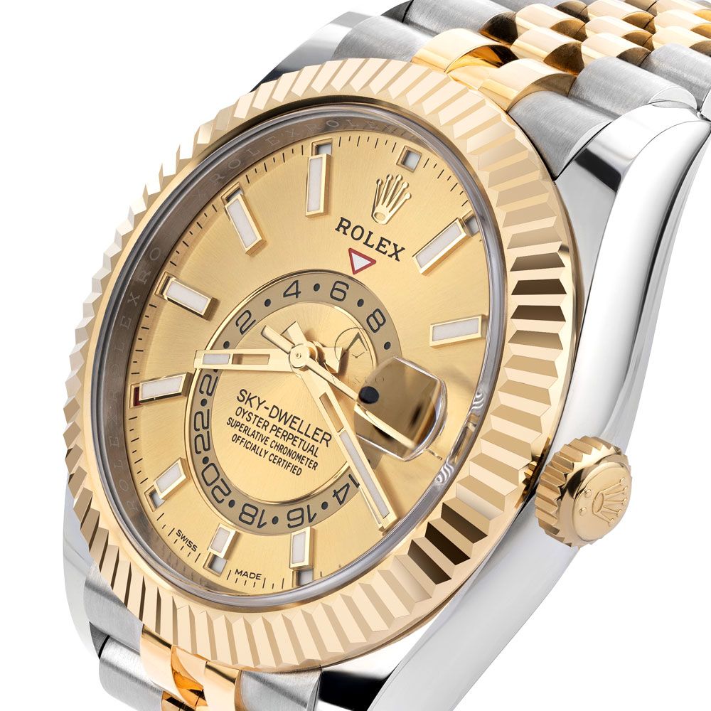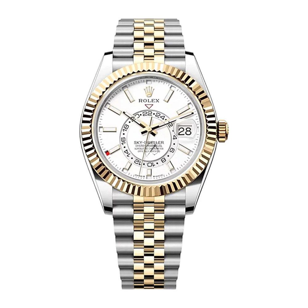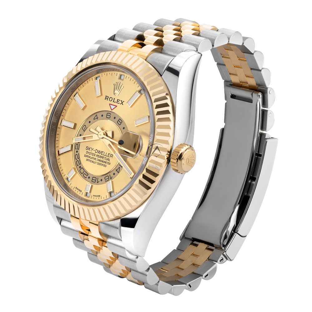 The Rolex Sky-Dweller 336933 is a refined fusion of luxury and functionality, featuring a 42 mm case crafted from stainless steel and 18K yellow gold in Rolex’s signature Rolesor combination. The champagne sunray dial is both elegant and highly legible, featuring baton hour markers, a second time zone displayed through an off-center 24-hour disc, and an annual calendar with discreet month indicators positioned at each hour marker. The fluted bezel, crafted from yellow gold, is more than a design icon—it works with Rolex’s Ring Command system to easily adjust the watch’s complex functions. Powered by the new-generation caliber 9002 automatic movement, the Sky-Dweller 336933 offers enhanced precision, durability, and a 72-hour power reserve. Paired with a solid-link Oyster bracelet for comfort and presence, this watch is an exceptional choice for world travelers who demand both technical performance and timeless style.