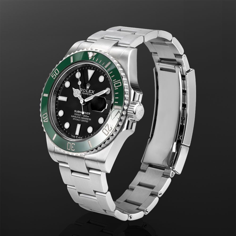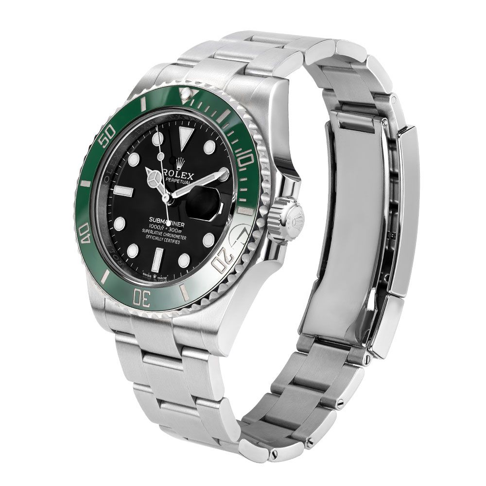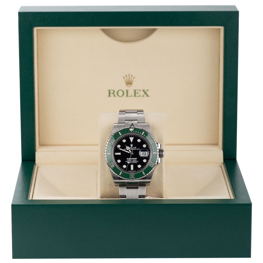 The Rolex Submariner 126610LV, known to enthusiasts as the Starbucks, is a striking evolution of Rolexs iconic dive watch, blending modern performance with unmistakable style. Crafted from robust Oystersteel and measuring 41mm, it features a sleek black dial with luminous hour markers and Mercedes hands for superior legibility, paired with a vibrant green Cerachrom bezel that adds a bold touch to its classic design. Powered by the advanced Caliber 3235 movement, it offers exceptional precision, durability, and a 70-hour power reserve. Water-resistant to 300 meters (1,000 feet) and equipped with a unidirectional bezel for precise dive timing, the Submariner 126610LV is built for underwater exploration yet refined enough for everyday wear. Finished with a solid Oyster bracelet and Glidelock extension system, this modern classic is a standout piece for collectors and dive watch enthusiasts alike.